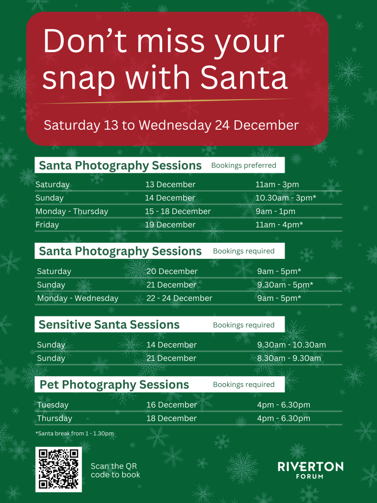 Please note: Walk ins are welcome until 20 December, unless sessions are fully booked. We recommend booking in advance to avoid any disappointment. Please be mindful that Santa will take a short break to feed his reindeer around 1pm. This will not impact booked sessions.